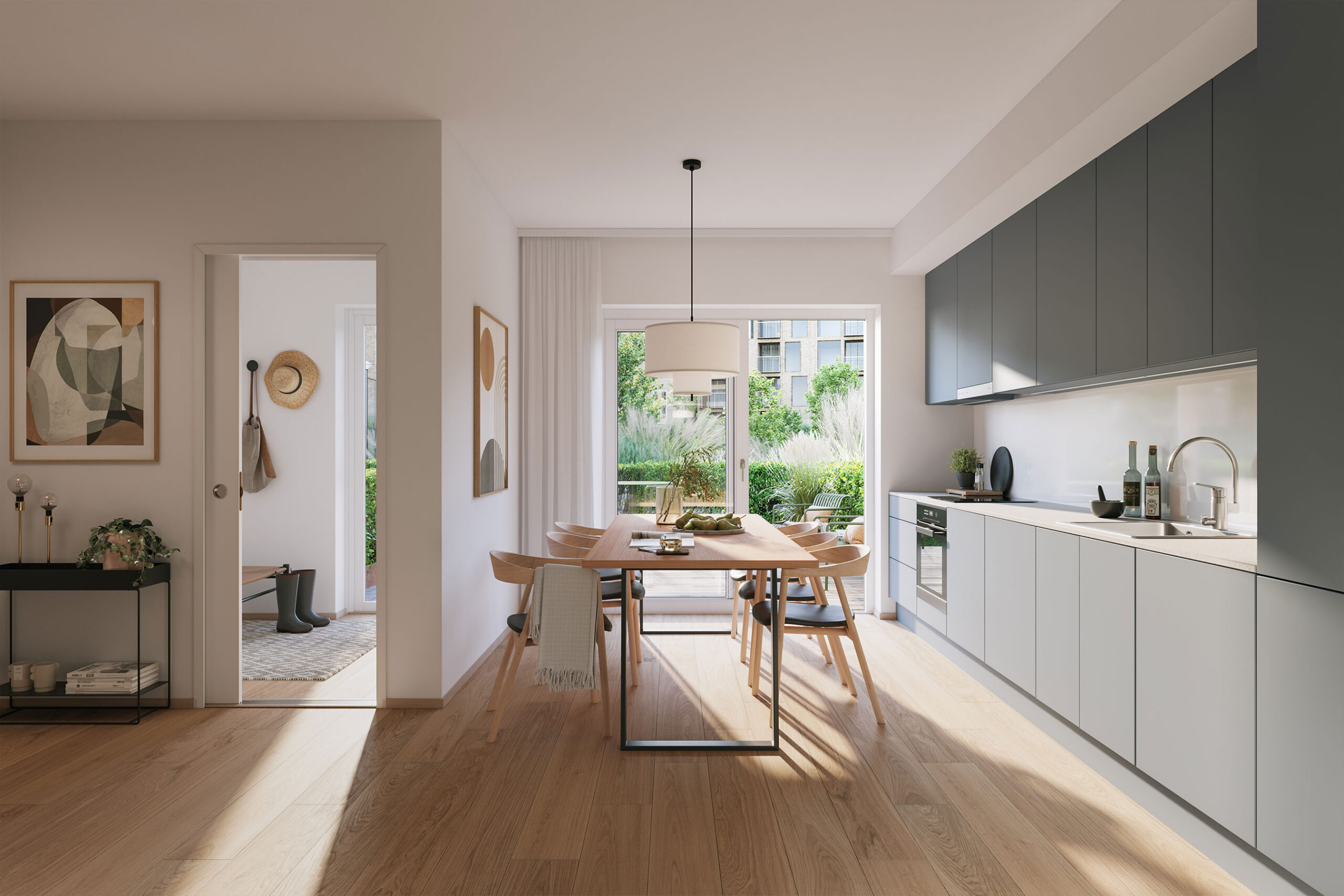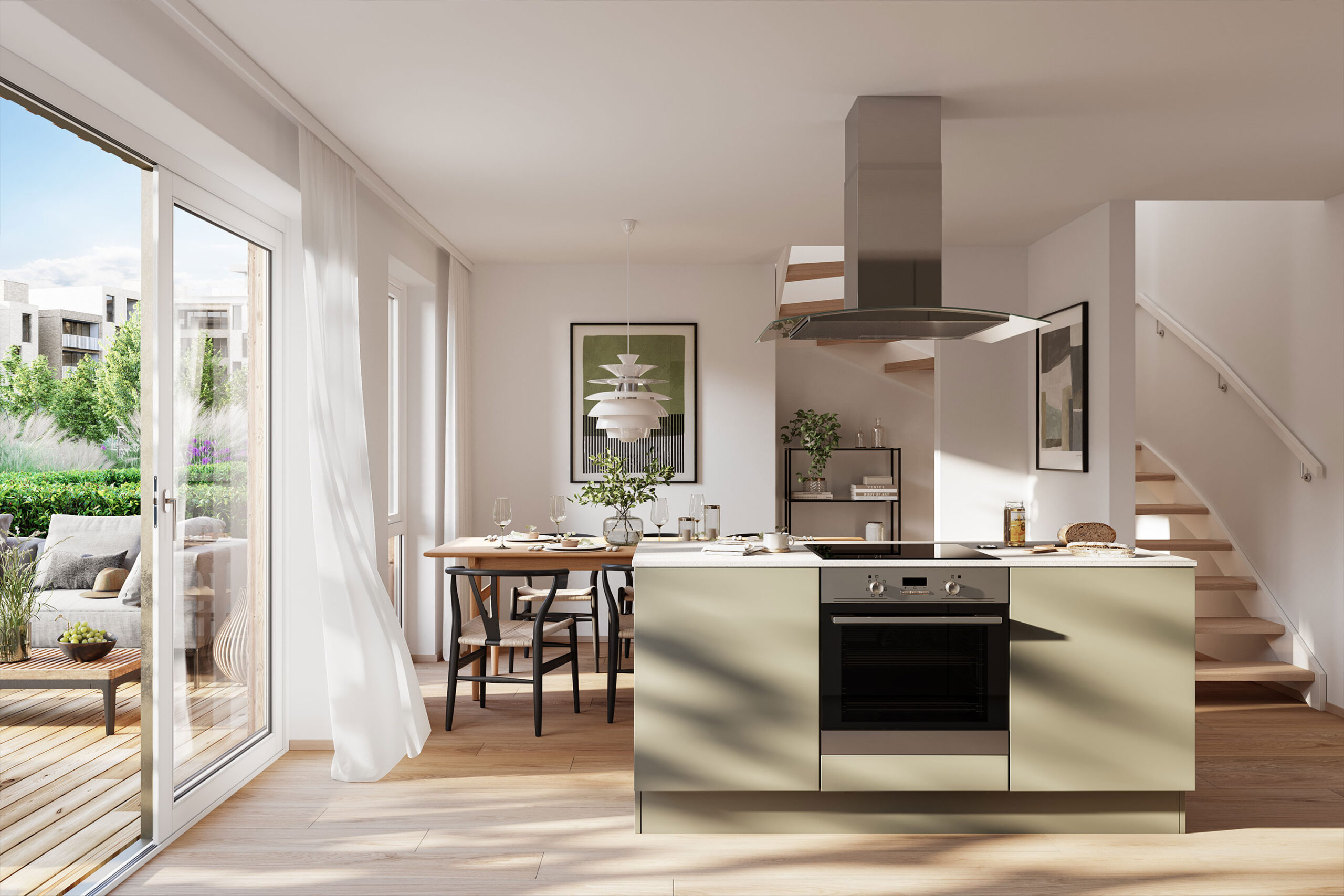 Illustrasjonen viser leilighet 01D. Også i denne leiligheten får du hage som en fin forlengelse av kjøkkenet.